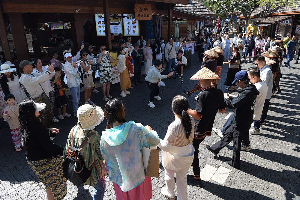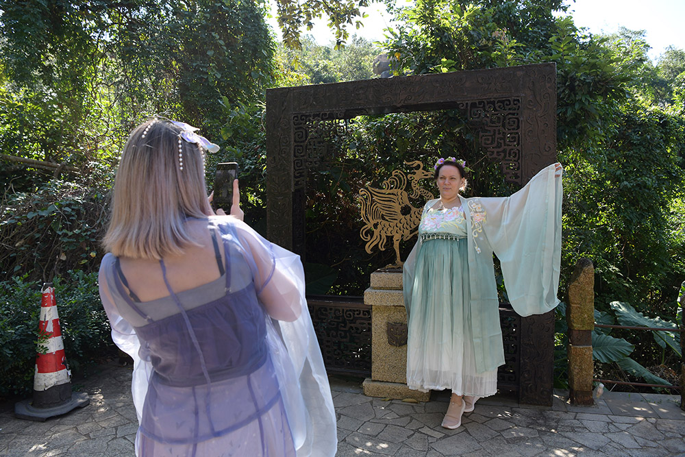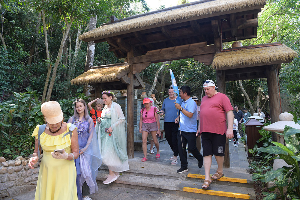 1月1日,元旦节当天,中外游客漫步在亚龙湾热带天堂森林旅游区兰花谷“天涯物语,拾光里”影视拍摄基地拍照打卡,体验手工艺制作,快乐地在景区欢度2026年元旦佳节。(黄庆优摄)