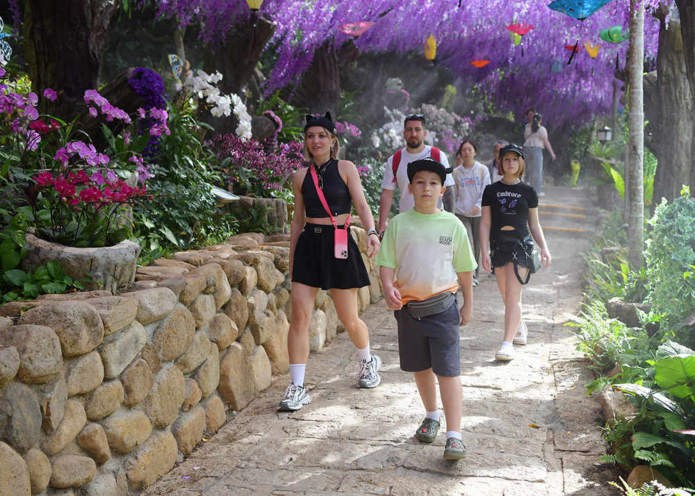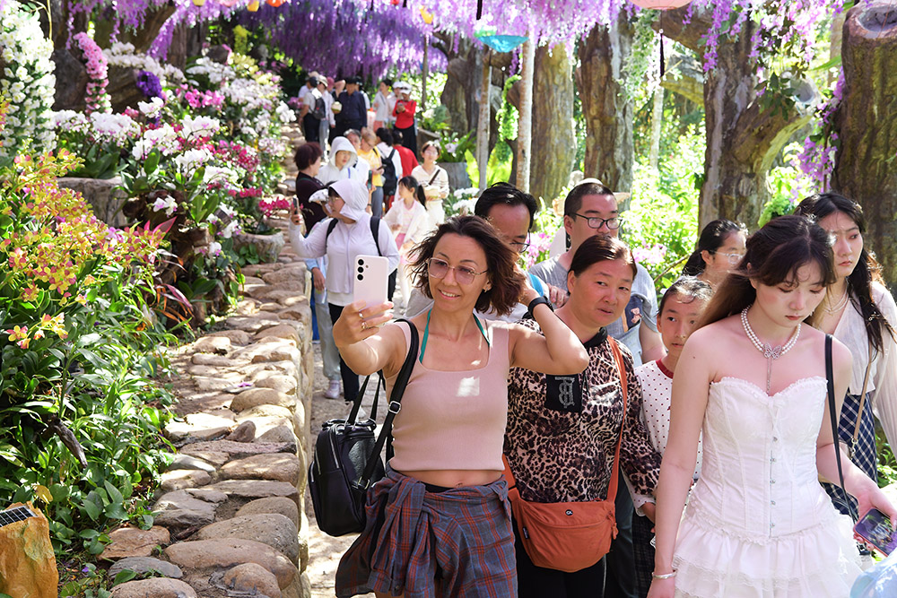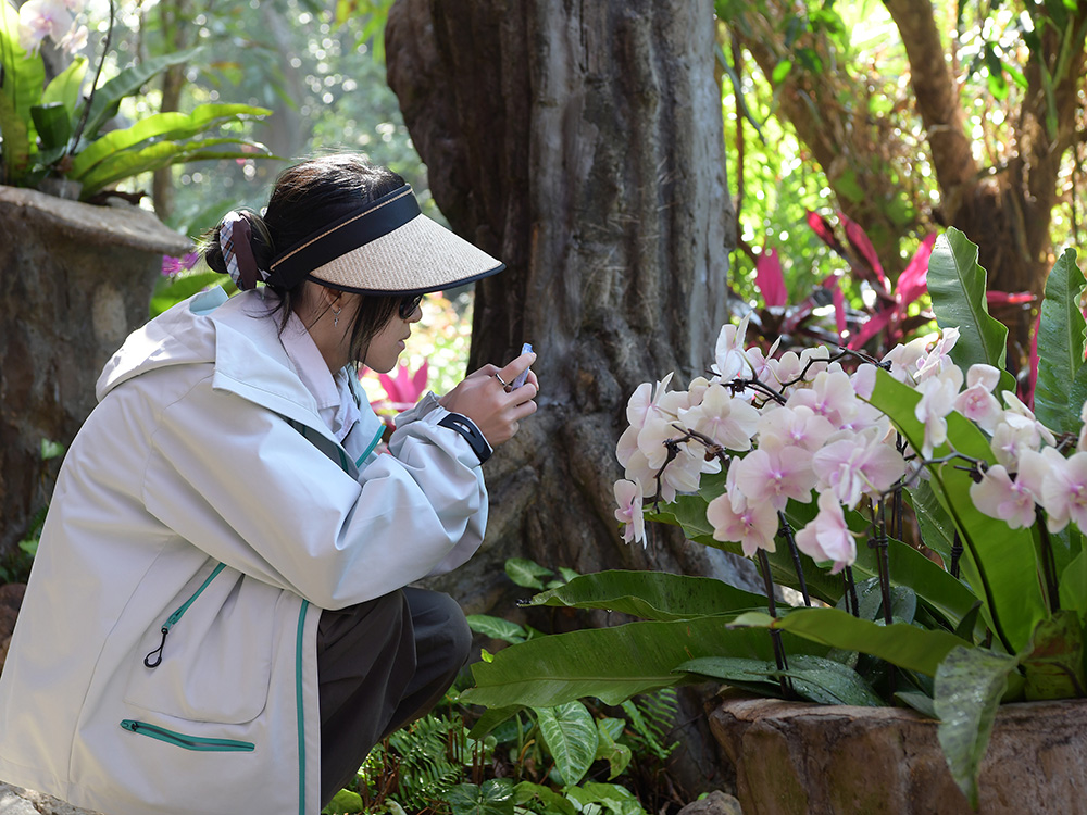 2026年2月4日,立春节气,草长莺飞,山花绽放。立春当天,众多中外游客漫步在三亚亚龙湾热带天堂森林旅游区赏花观景,感受春暖花开的美丽景色。(黄庆优摄)