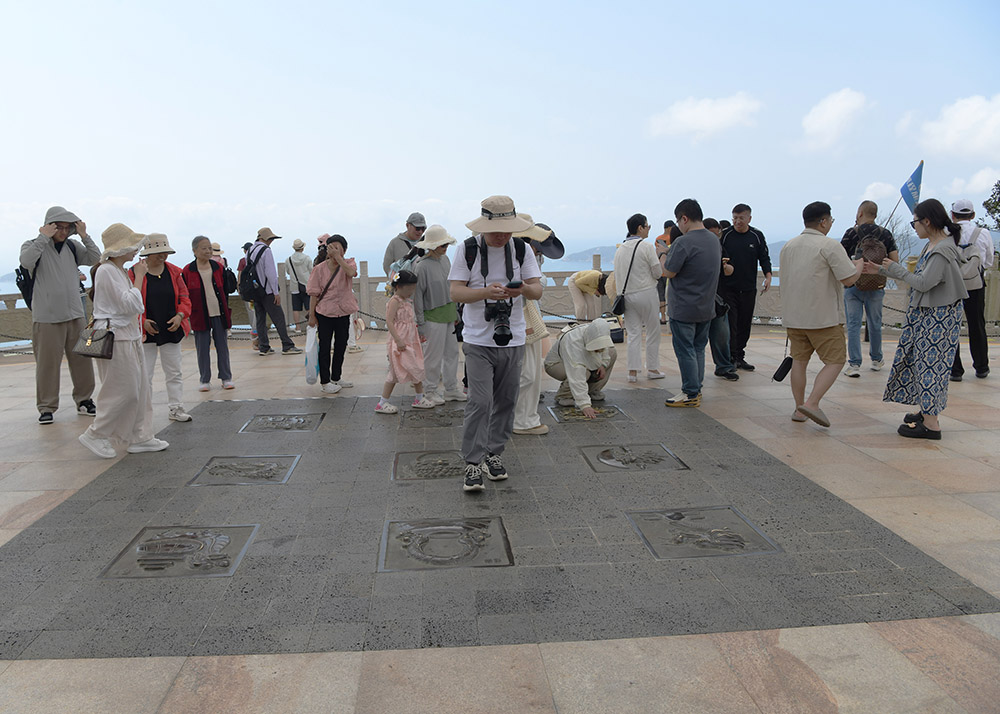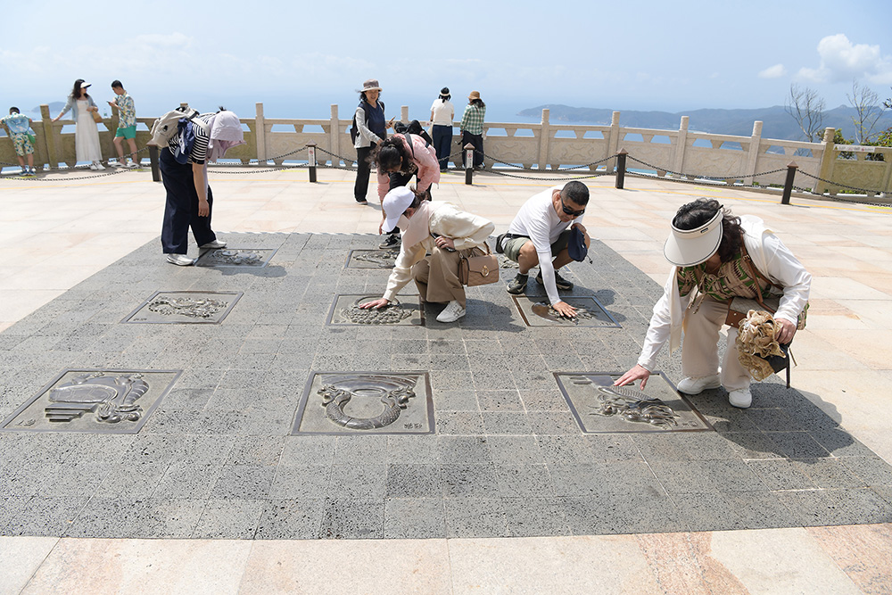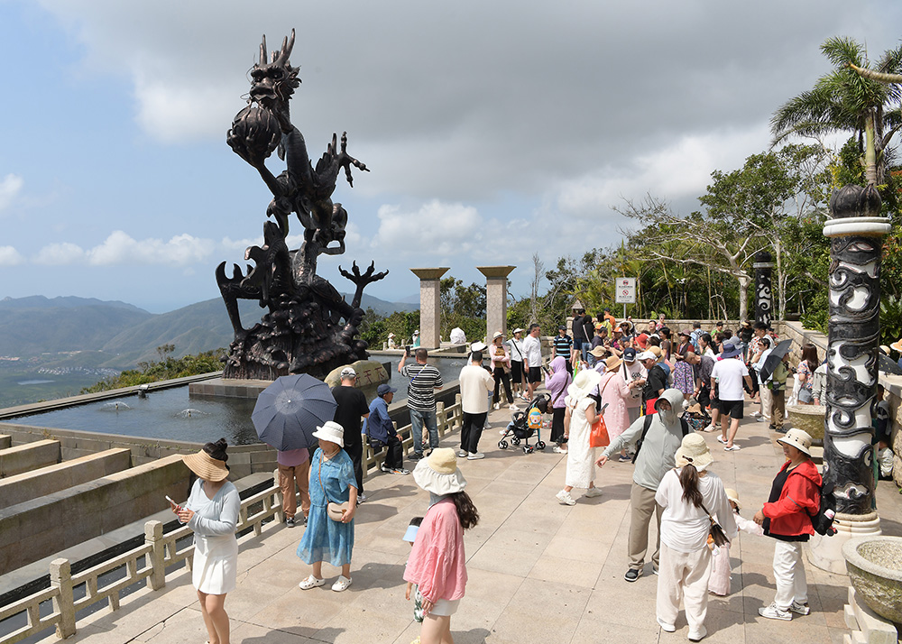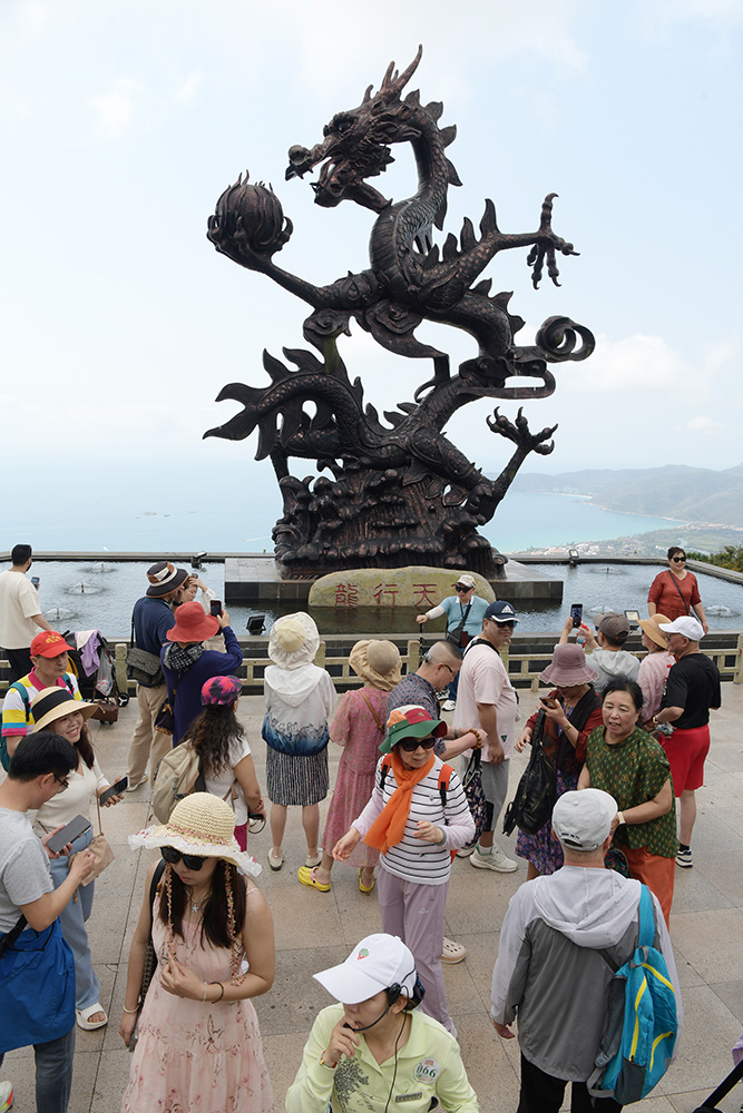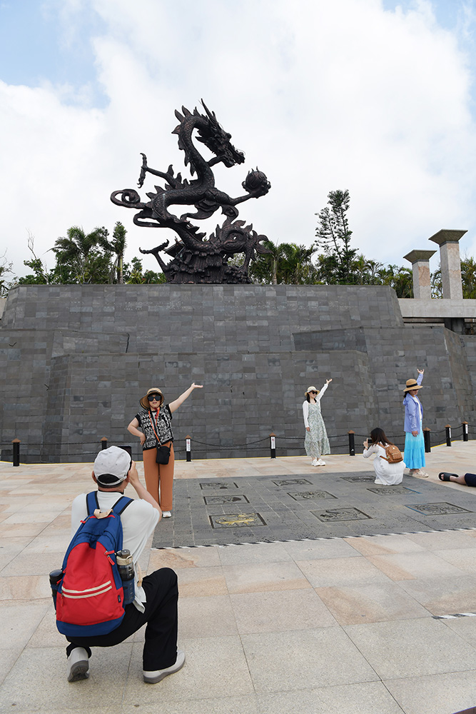3月20日,今天是我国民间传统节日二月二龙抬头节,众多游客来到三亚亚龙湾热带天堂森林旅游区龙雕广场上游玩打卡。聆听导游讲解龙的文化和传说,触摸龙雕与龙雕合影,祈福平安健康,风调雨顺,国泰民安。(黄庆优摄)